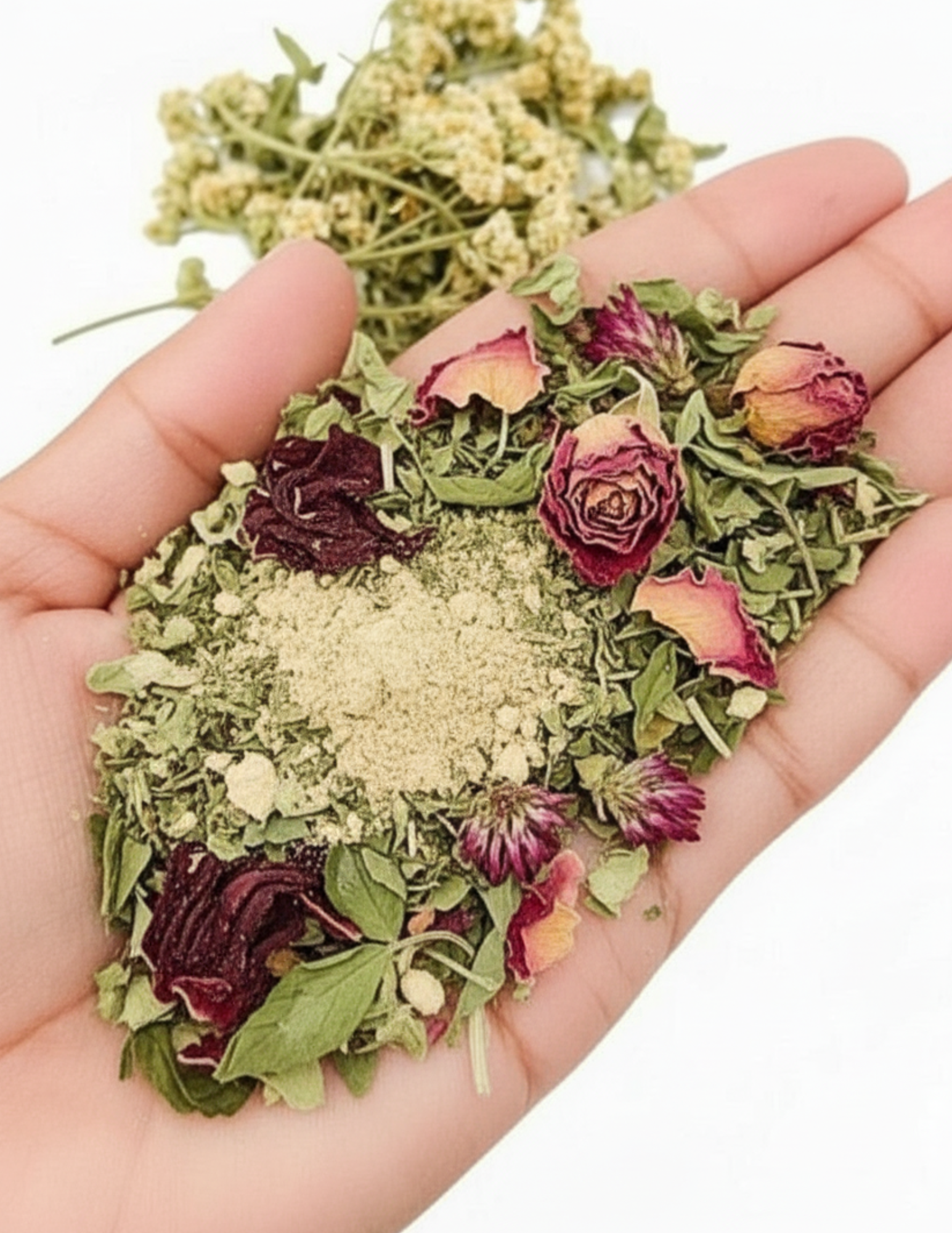 Womb & Hormone Bloom Herbal Tea is a vibrant, all-natural loose infusion thoughtfully crafted to support women’s hormonal balance, ease hot flashes, reduce mood swings, boost energy, and improve overall well-being. Featuring a synergistic blend of herbs such as Maca root, Ashwagandha, Red Raspberry Leaf, Hibiscus, Tulsi (Holy Basil), Red Clover, and Rose Petals, this nourishing tea helps your body find its natural rhythm, reduce stress, and restore radiance from within.